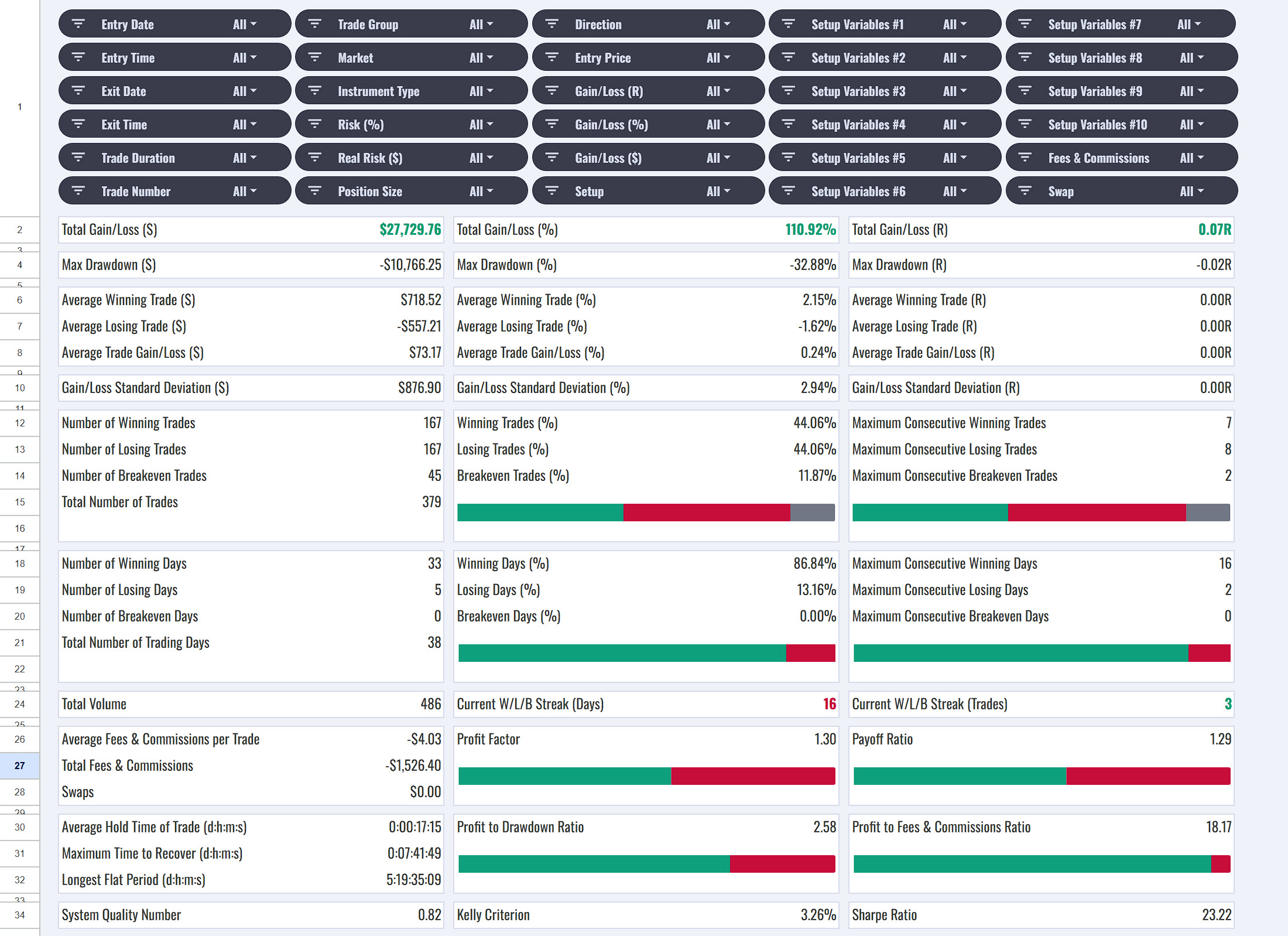 The Backtesting Club trading journal is not just an ordinary Google Sheets template for recording and analyzing executed trades. It is also a sophisticated backtesting spreadsheet that makes it easy to test your new trading strategies.