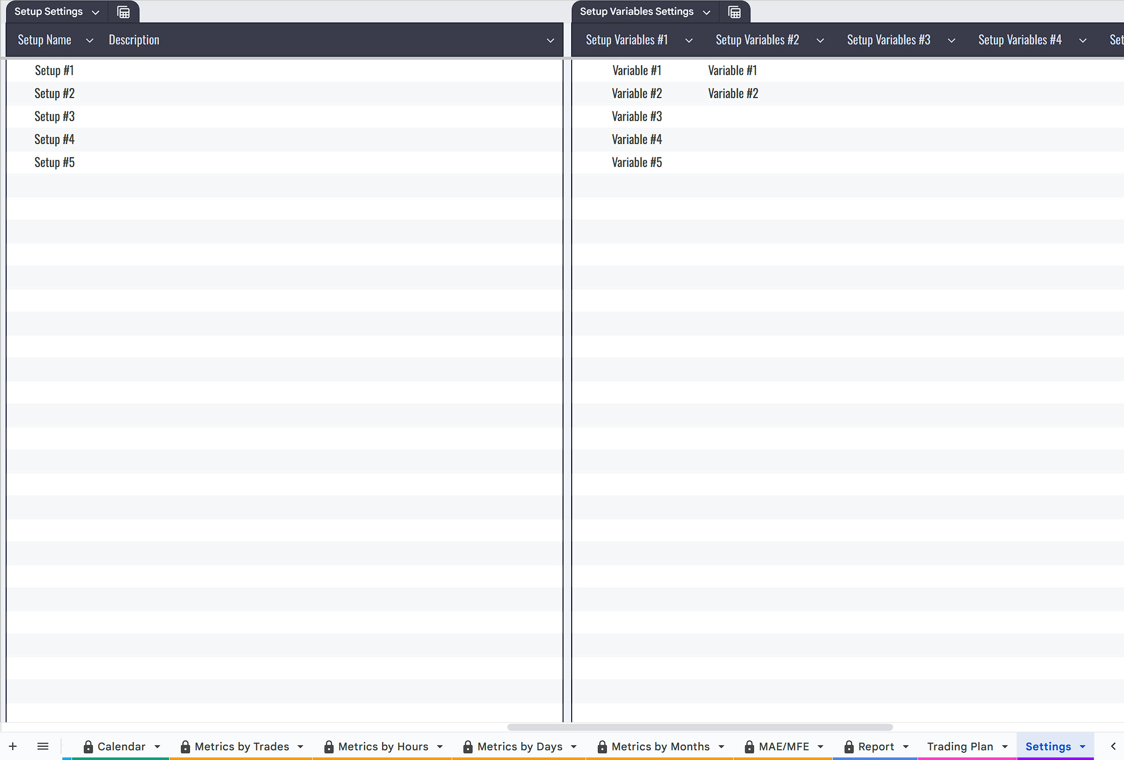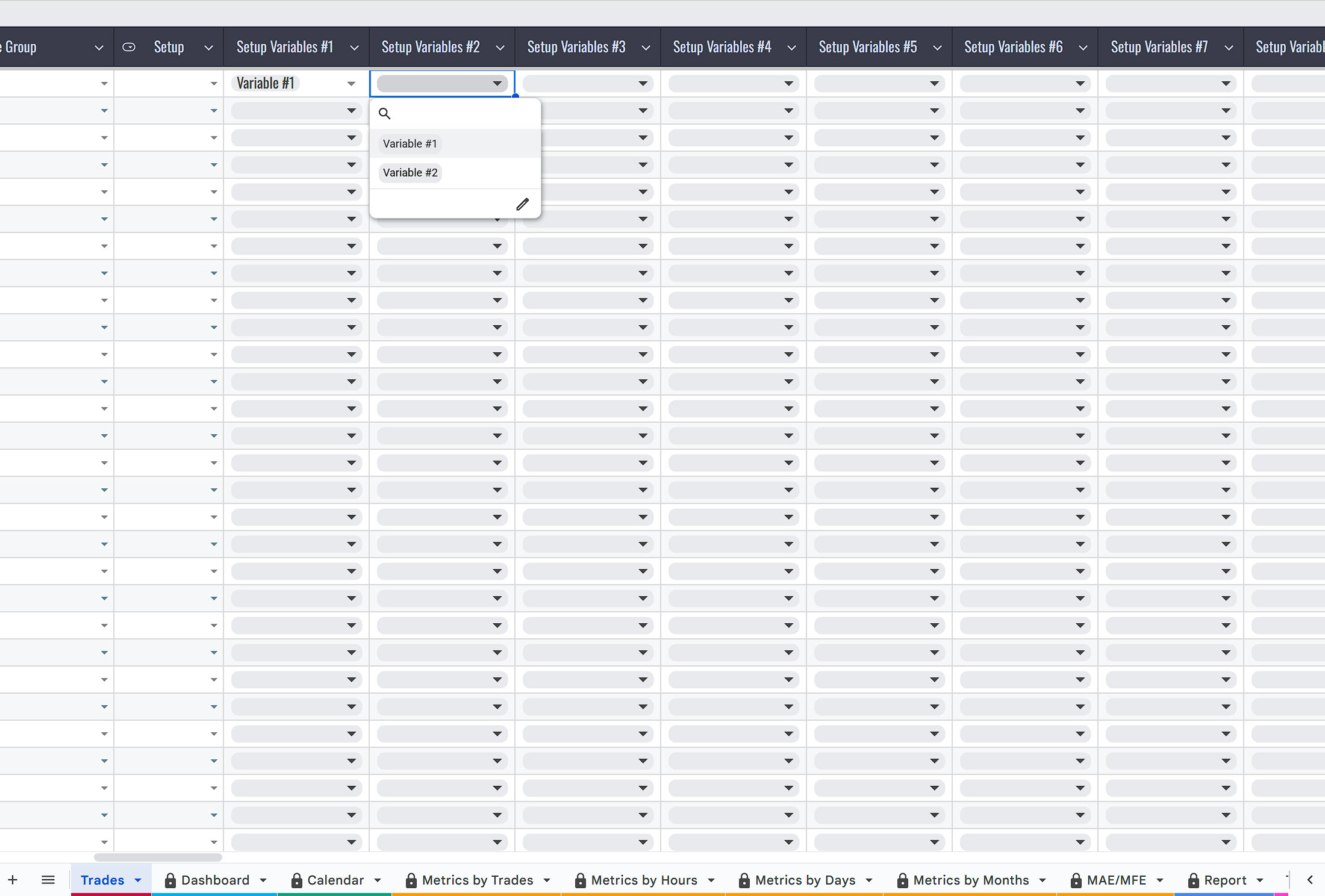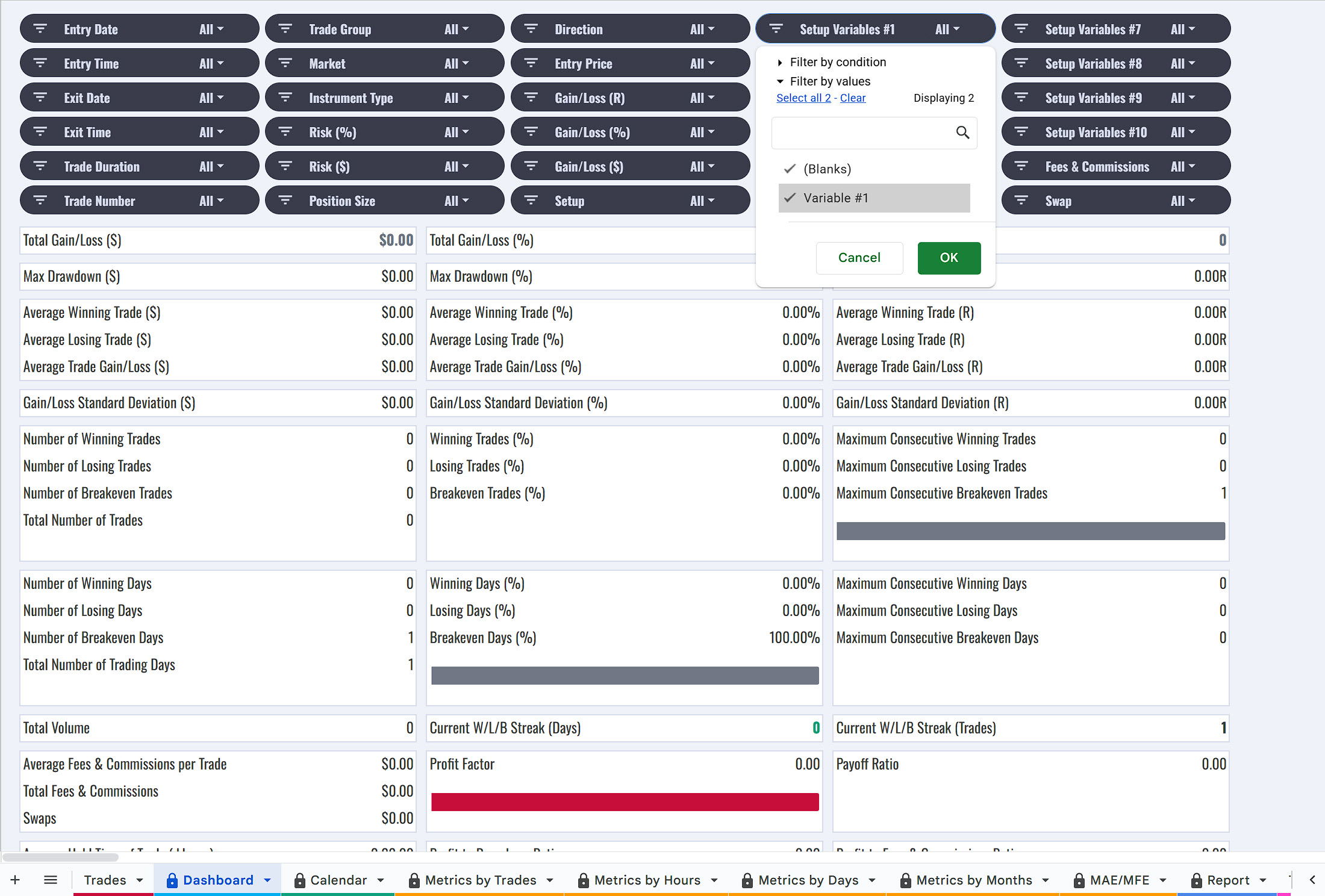 Learn more about your trades! Record up to ten groups of variables and then use them to filter your trades. This allows you to collect data on the quality of your setup, market conditions, your mental state, price action factors, indicator positions, etc. The possibilities are truly endless, and it’s up to you to decide what you focus on.