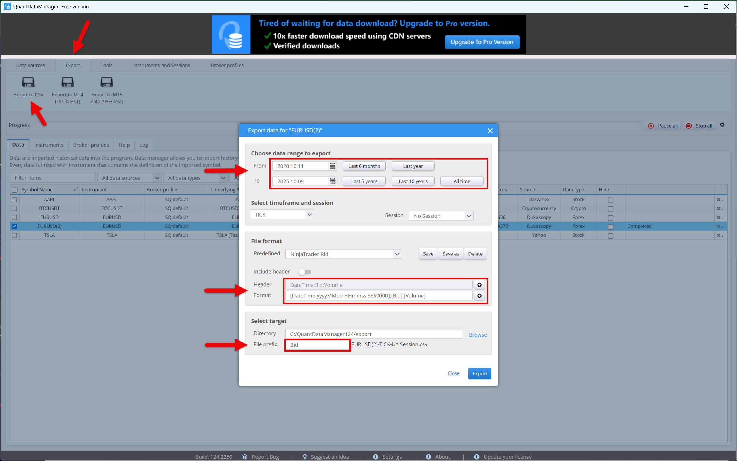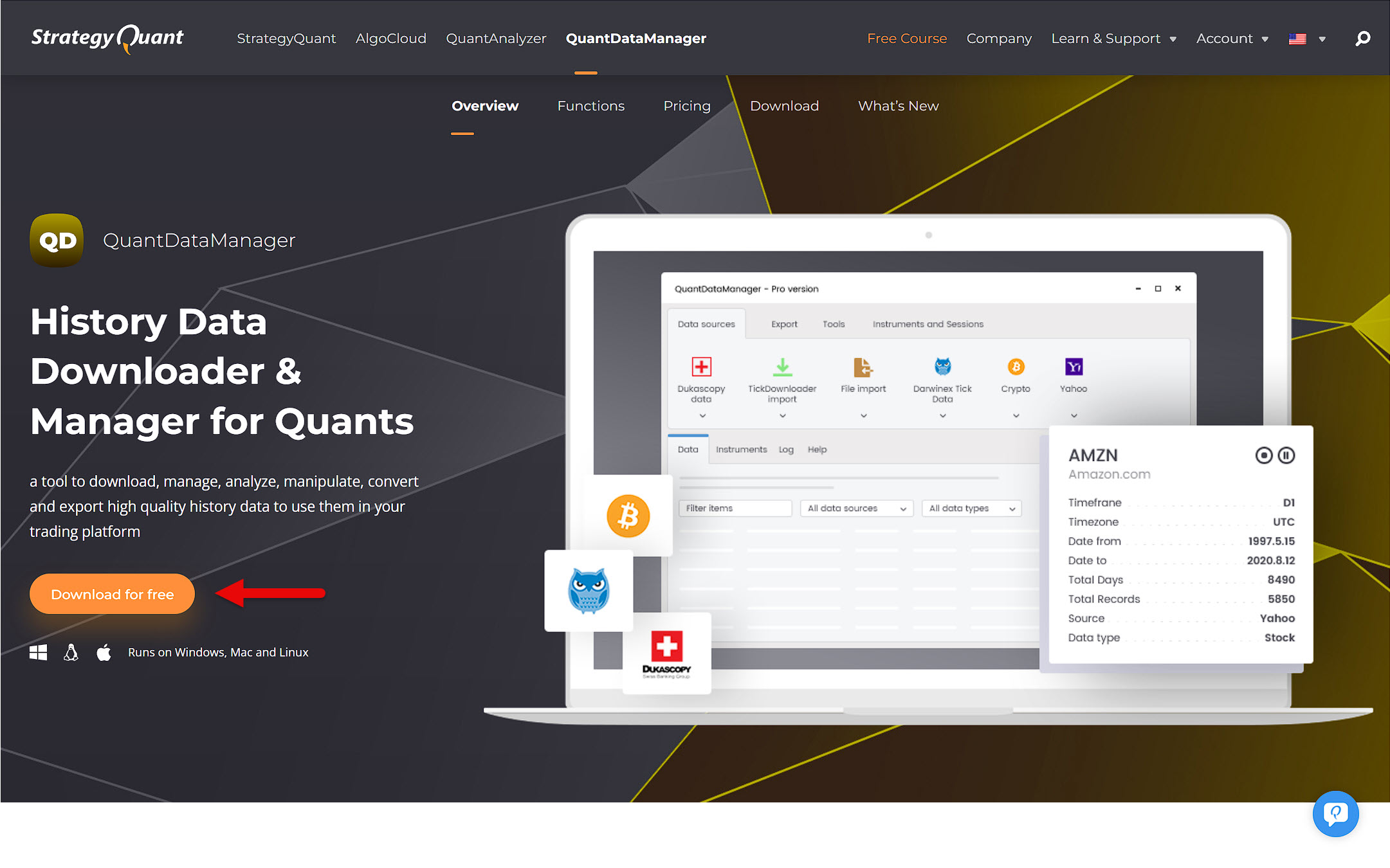 For this purpose, we will use the free Quant Data Manager software, which can download and edit historical data from Dukascopy, Darwinex, Yahoo Finance, and several other sources, including cryptocurrency exchanges such as Binance.