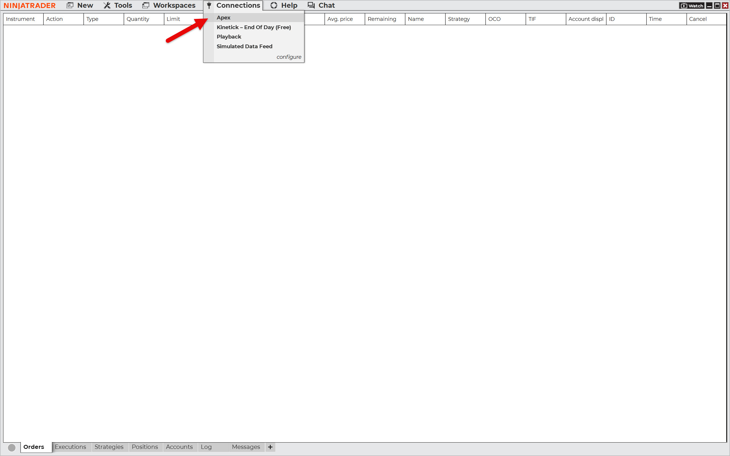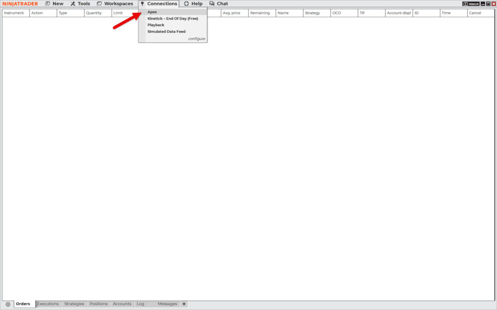 Before you start downloading, you must first connect to your data source. Select Connections from the main panel and then your data provider. In this example, Apex Trader Funding is used.