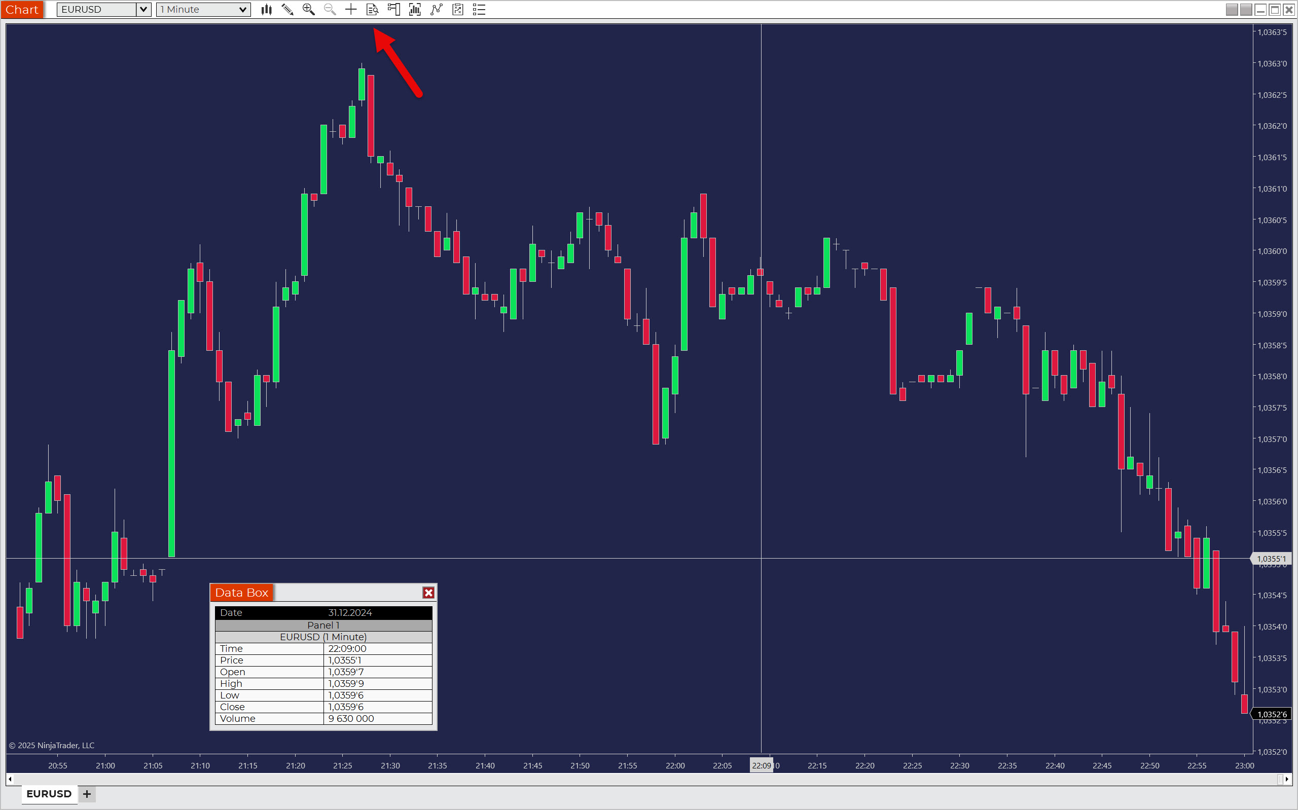 To avoid having to laboriously read the data from the chart, open the Data Box window by clicking on the icon indicated by the arrow in the screenshot below.