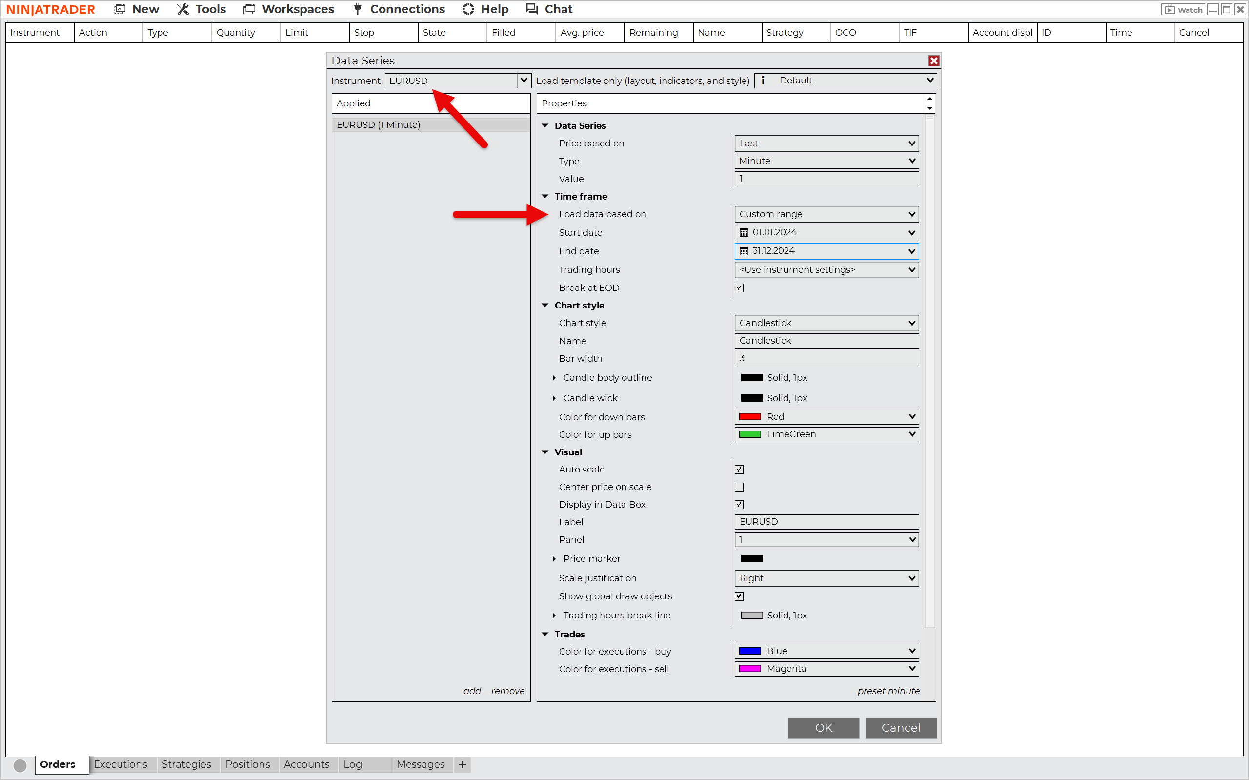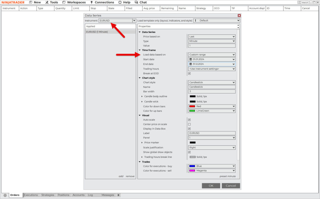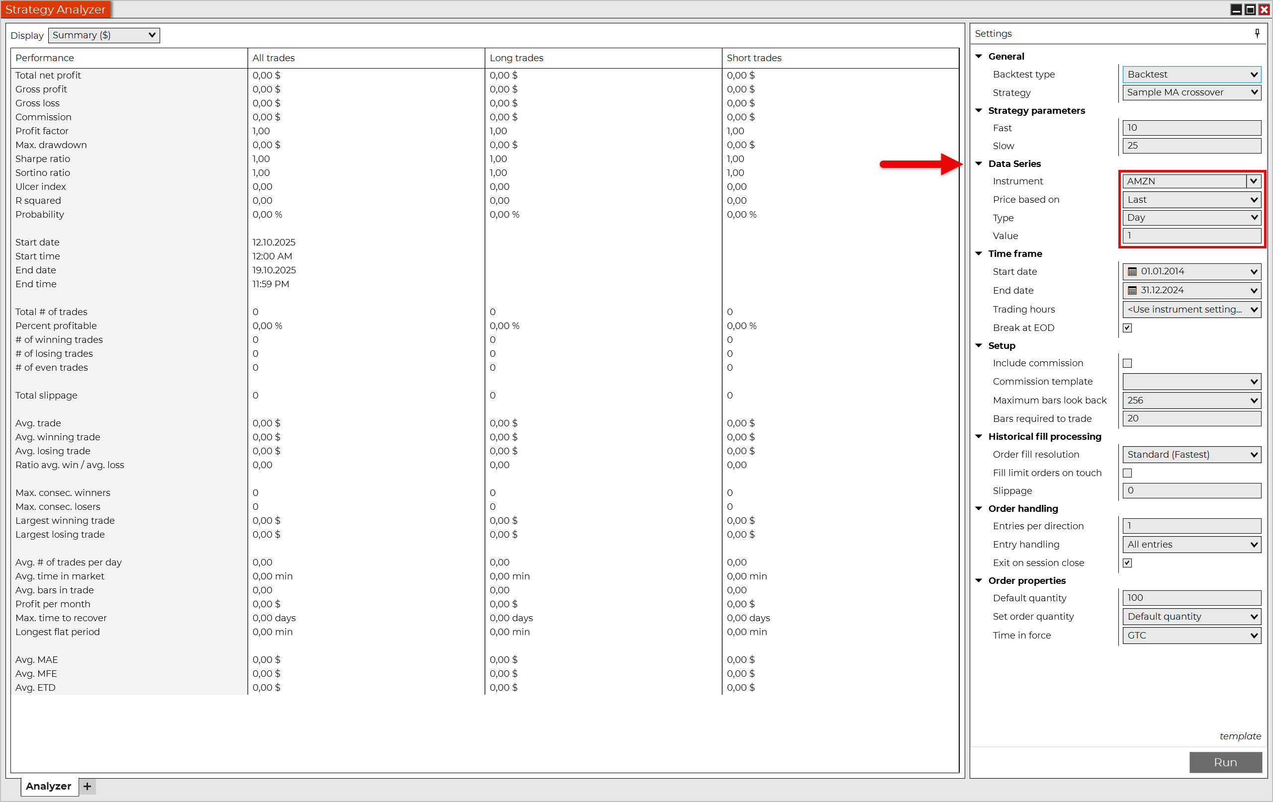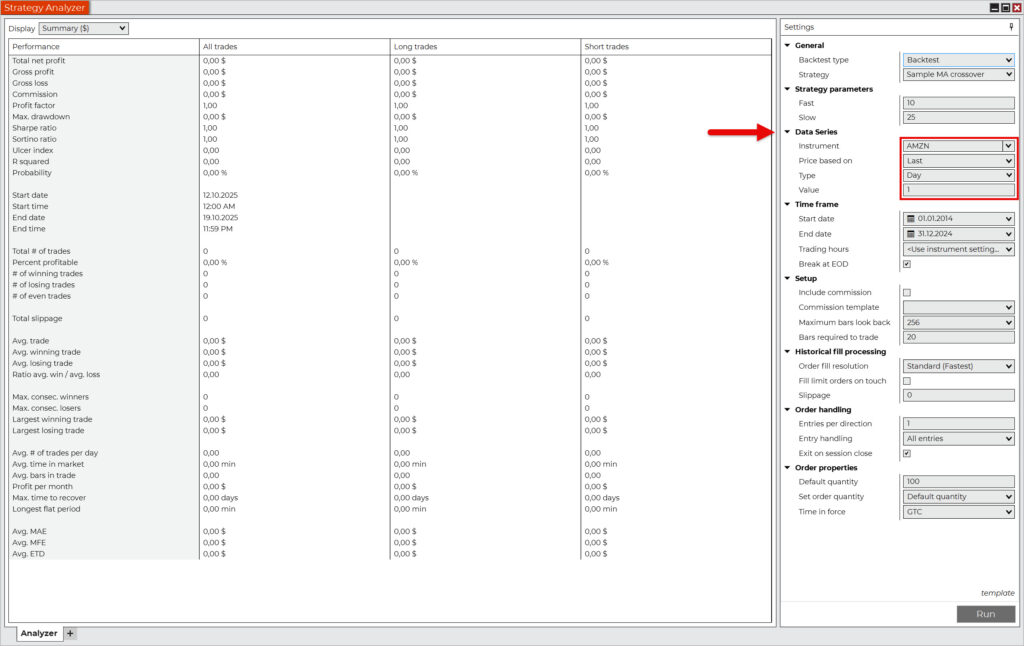 In the Data Series section, select the instrument (market) you want to backtest and the time frame (chart) that the strategy should use.