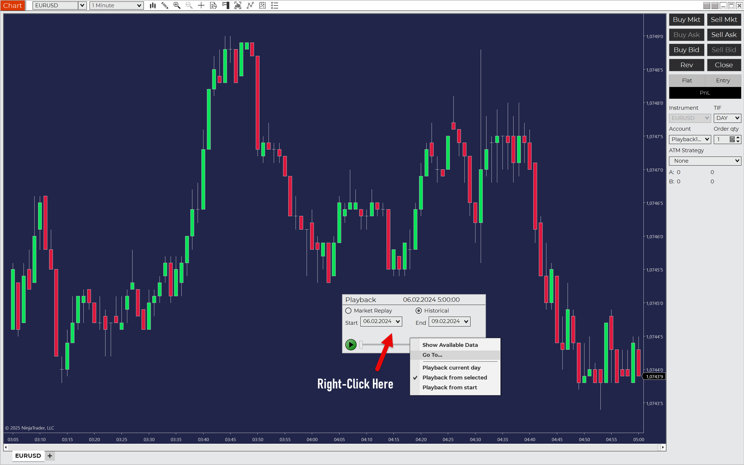 In the Playback window, first select whether you want to replay Market Replay Data or Historical Data. Then choose the period to playback. This will move the chart to the beginning of the period you have defined.