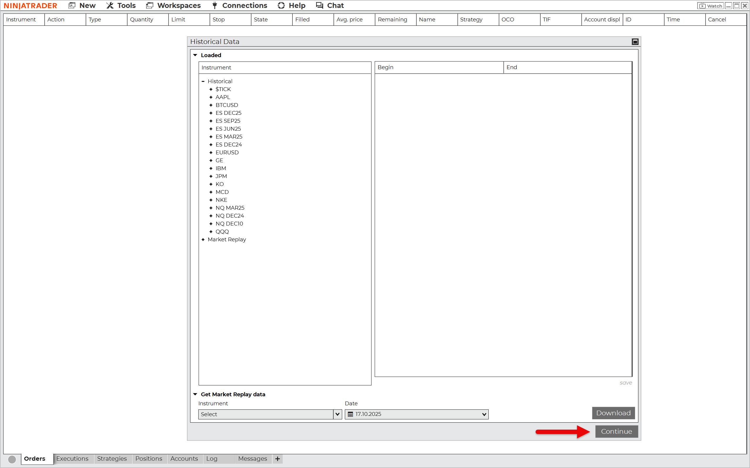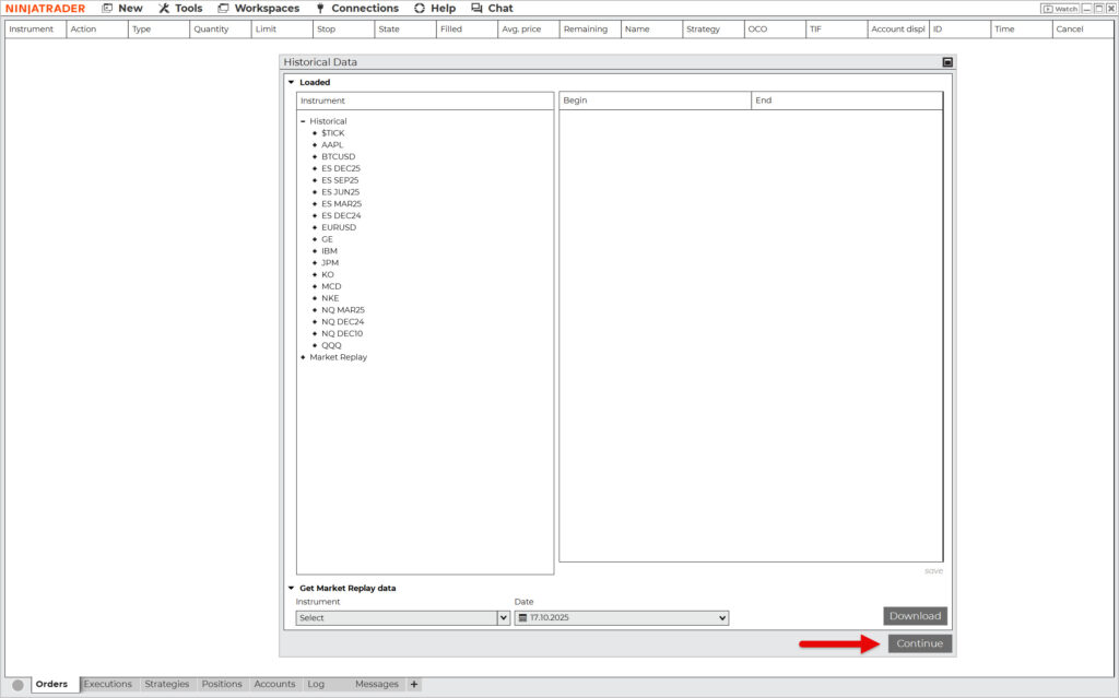 Since we have already downloaded the historical data for playback, continue by pressing the Continue button.
