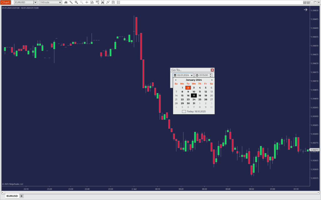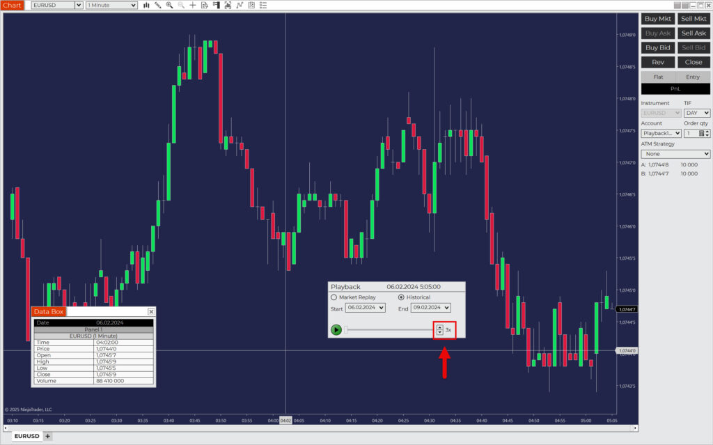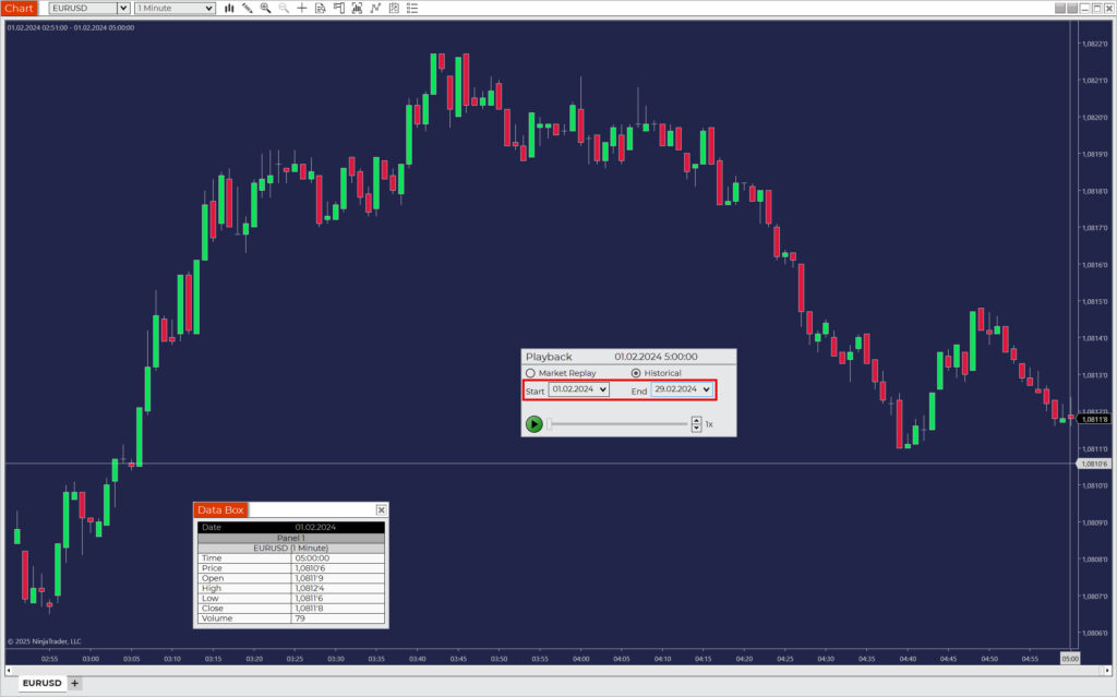 Note: Replaying in NinjaTrader works by updating the price every second (if a change has occurred). Not tick-by-tick. Therefore, the platform is not a true simulator of a real market environment like Sierra Chart, for example.