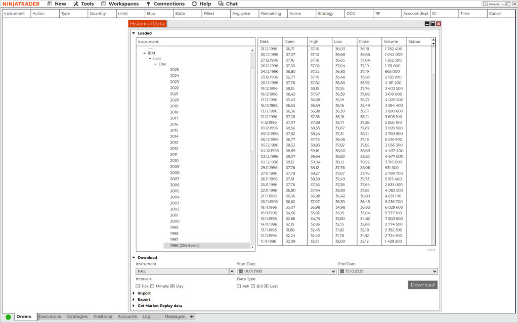 The same built-in downloader can also be used to download historical tick-by-tick, 1-minute, and daily data from your market data provider. Typically, you can obtain tick-by-tick data for the last year and up to 25 years of 1-minute data for selected instruments.