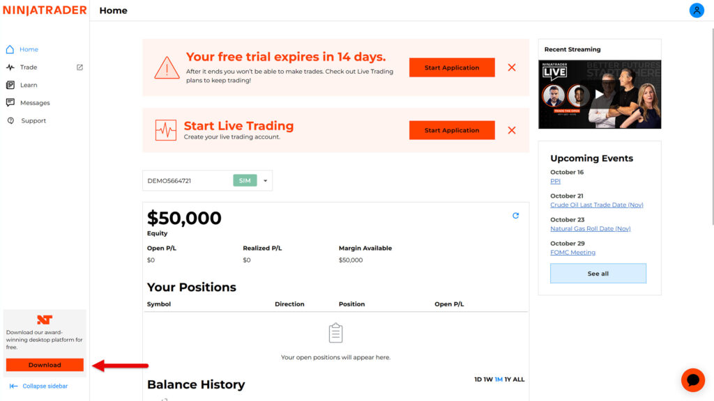 You should now see the web interface for managing your account. In the lower left corner, click the Download button and save the NinjaTrader installation file to your hard drive.