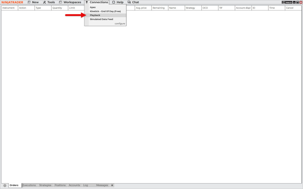 Next, select Connections > Playback from the main panel. This will open the familiar Historical Data window.