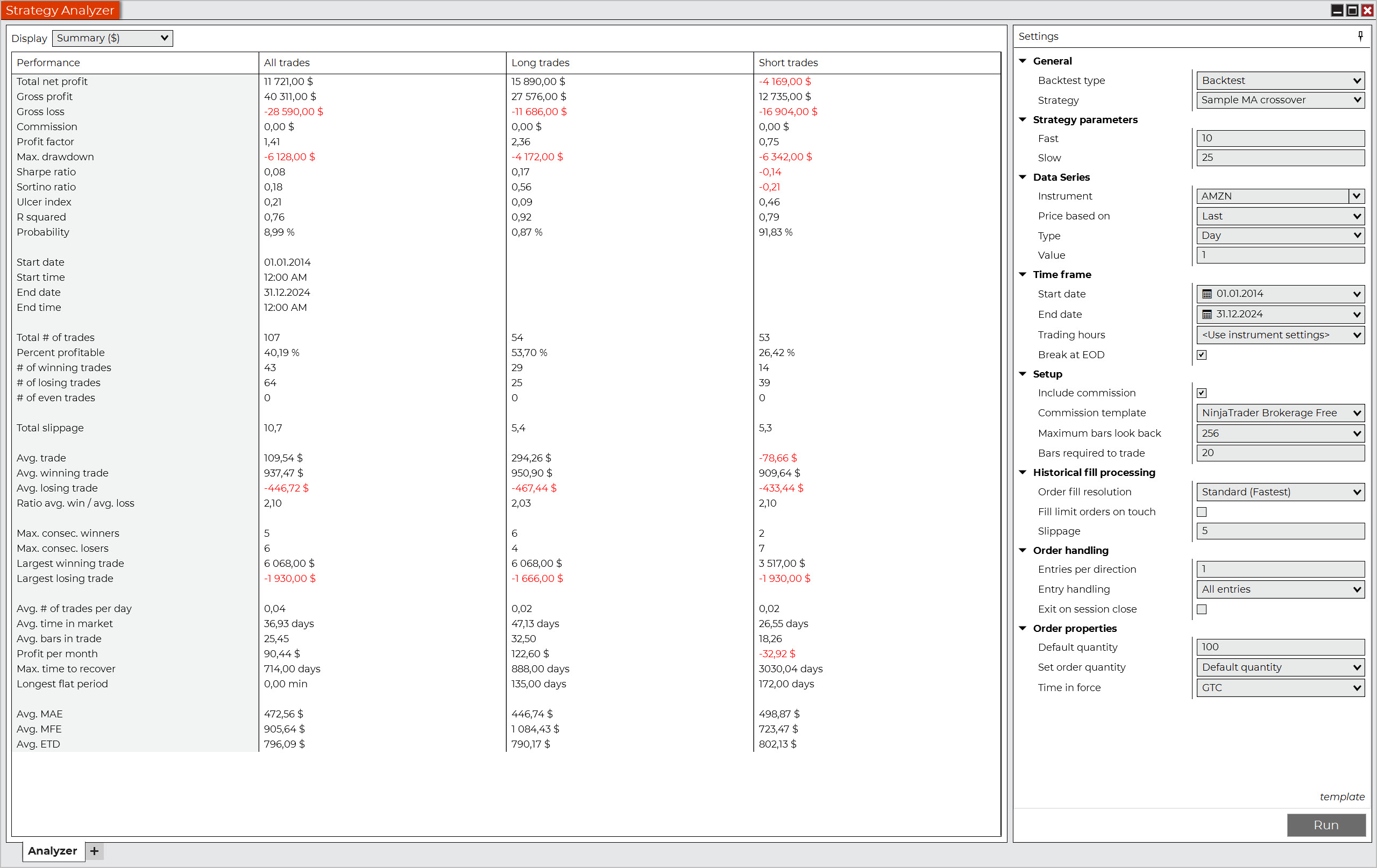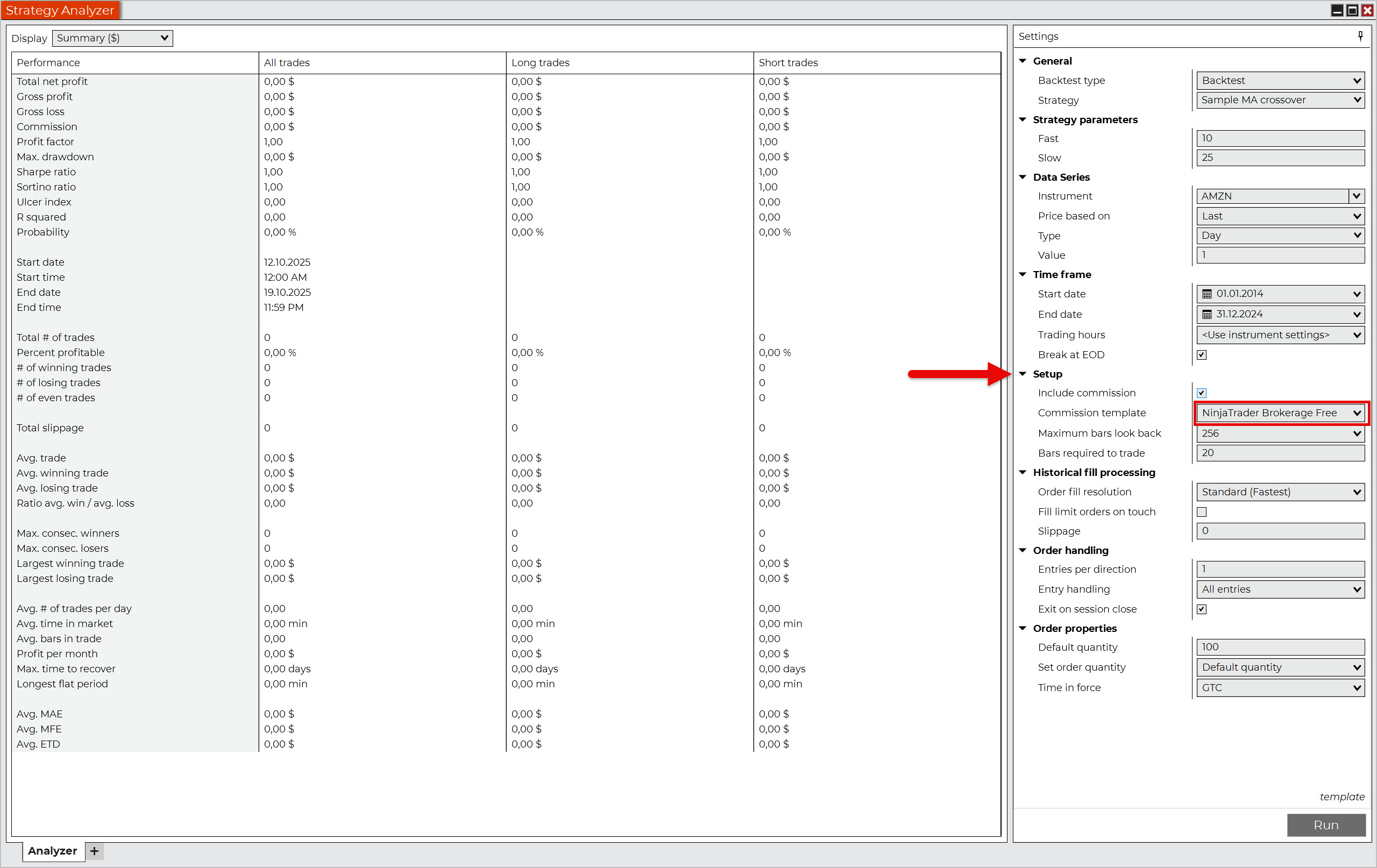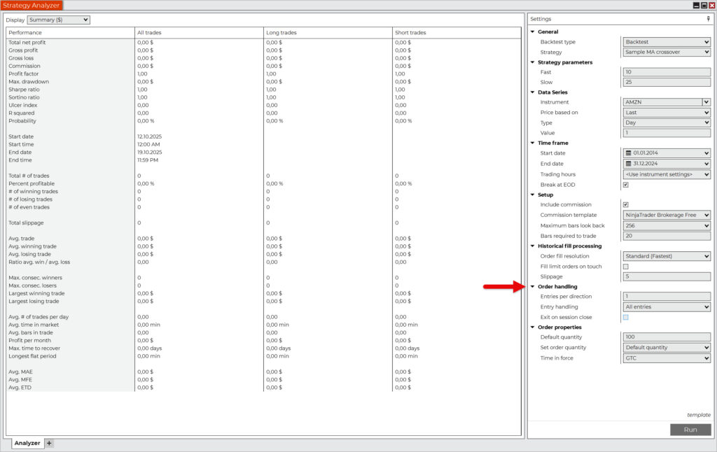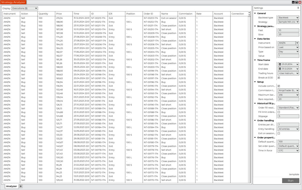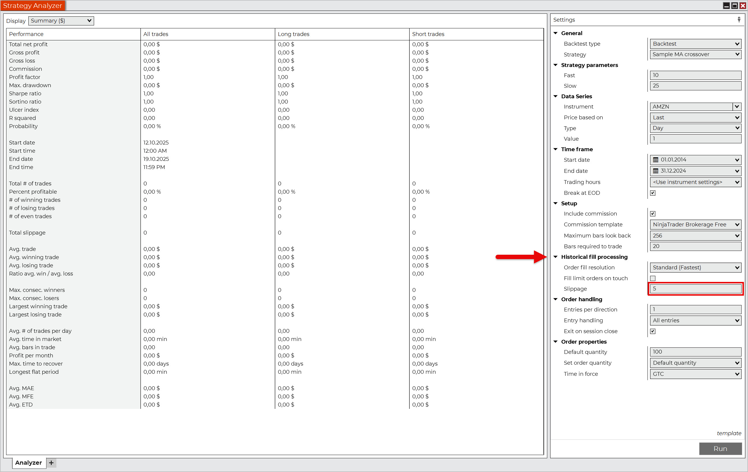 At your discretion, you can also select the execution slippage. NinjaTrader expects you to enter this value in ticks. Since we are backtesting the AMZN stock in our example, one tick corresponds to one cent.