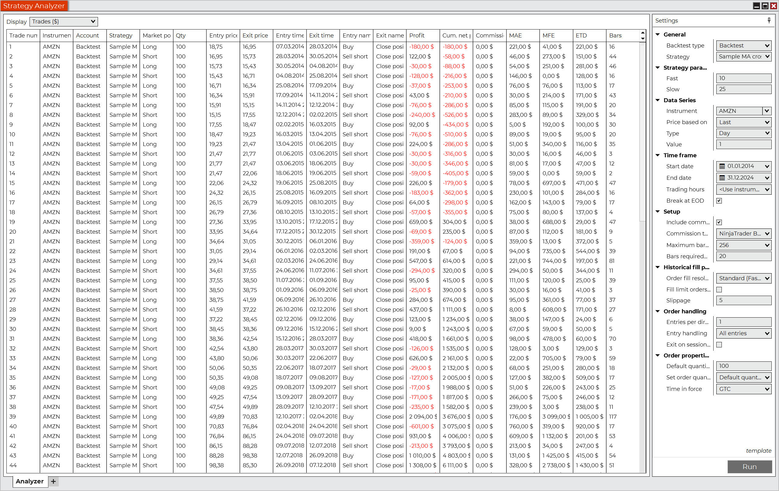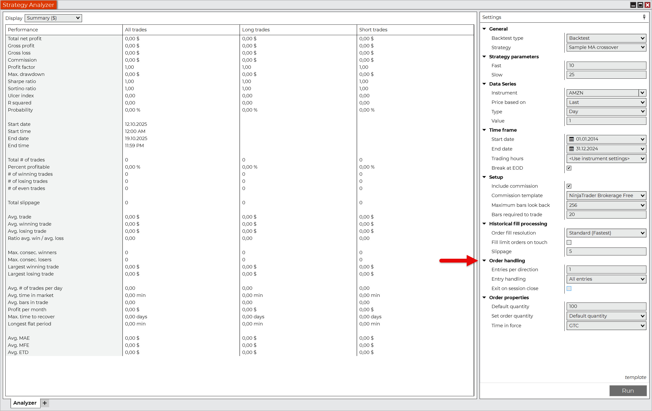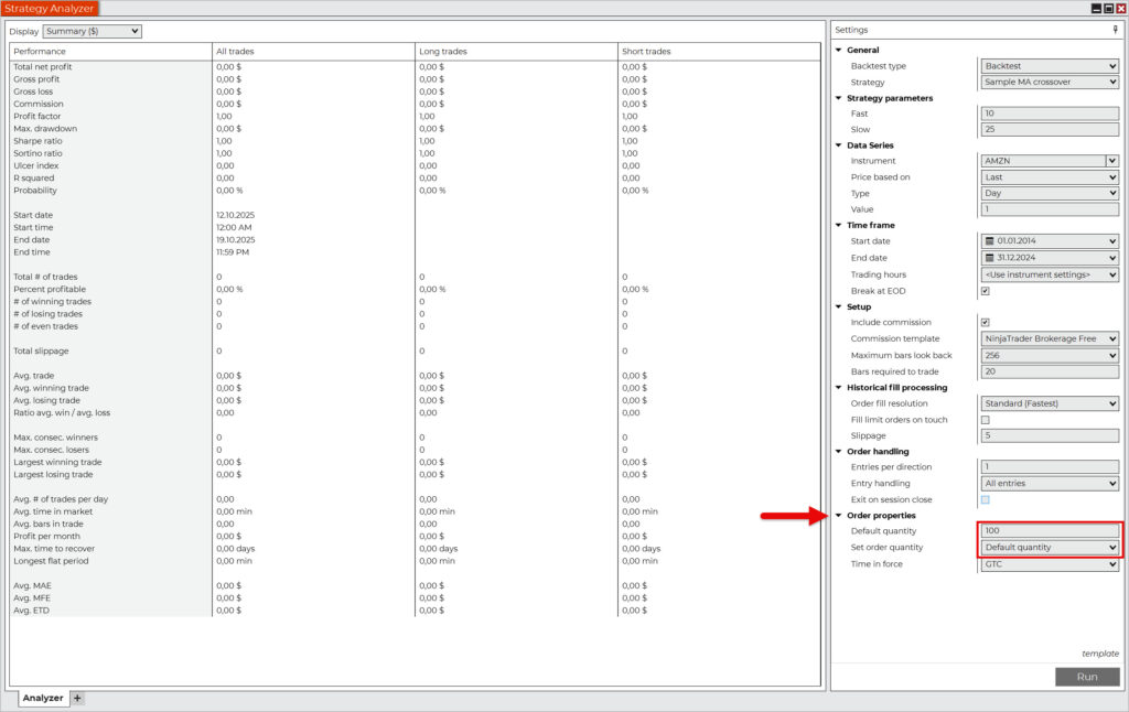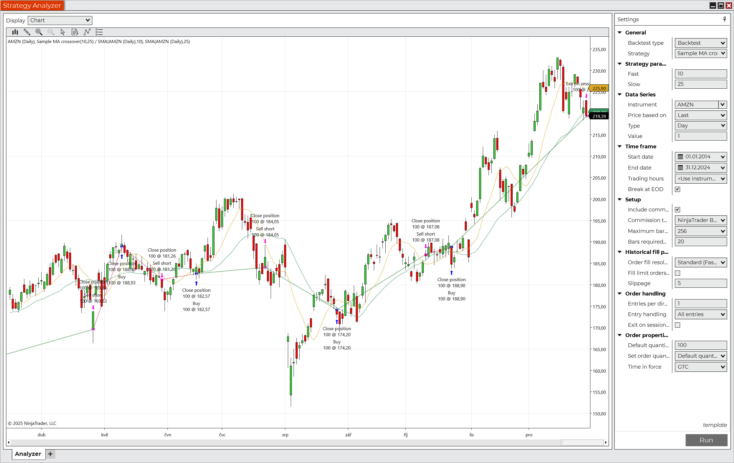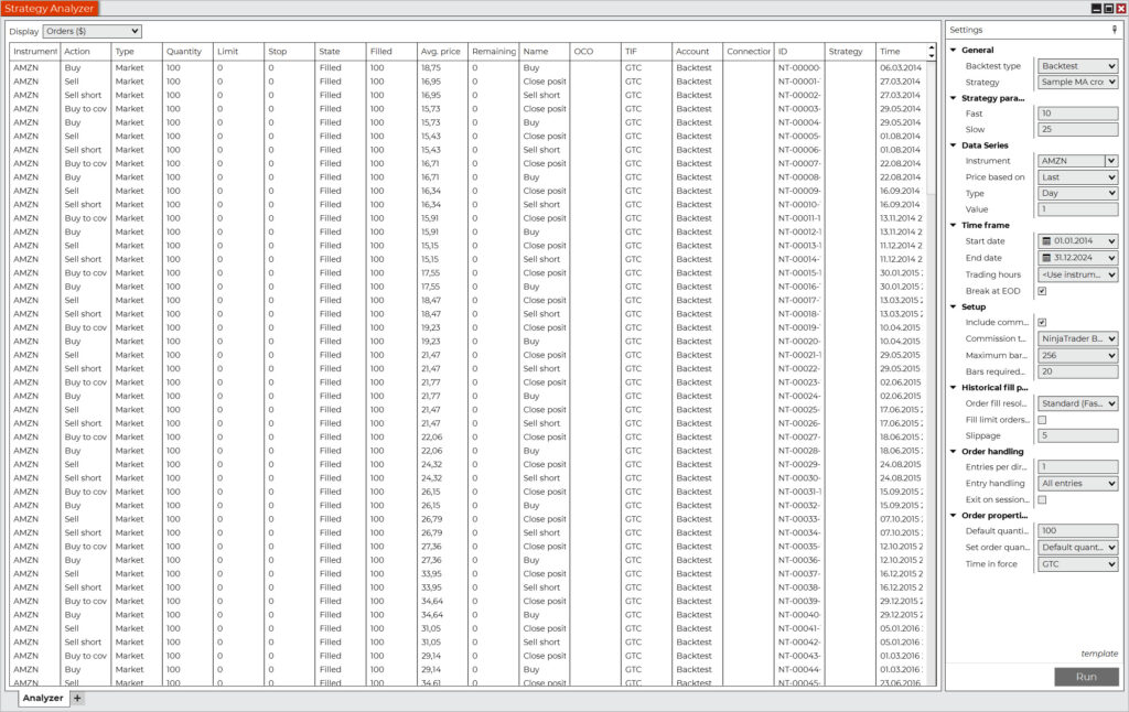 At your discretion, you can also select the execution slippage. NinjaTrader expects you to enter this value in ticks. Since we are backtesting the AMZN stock in our example, one tick corresponds to one cent.