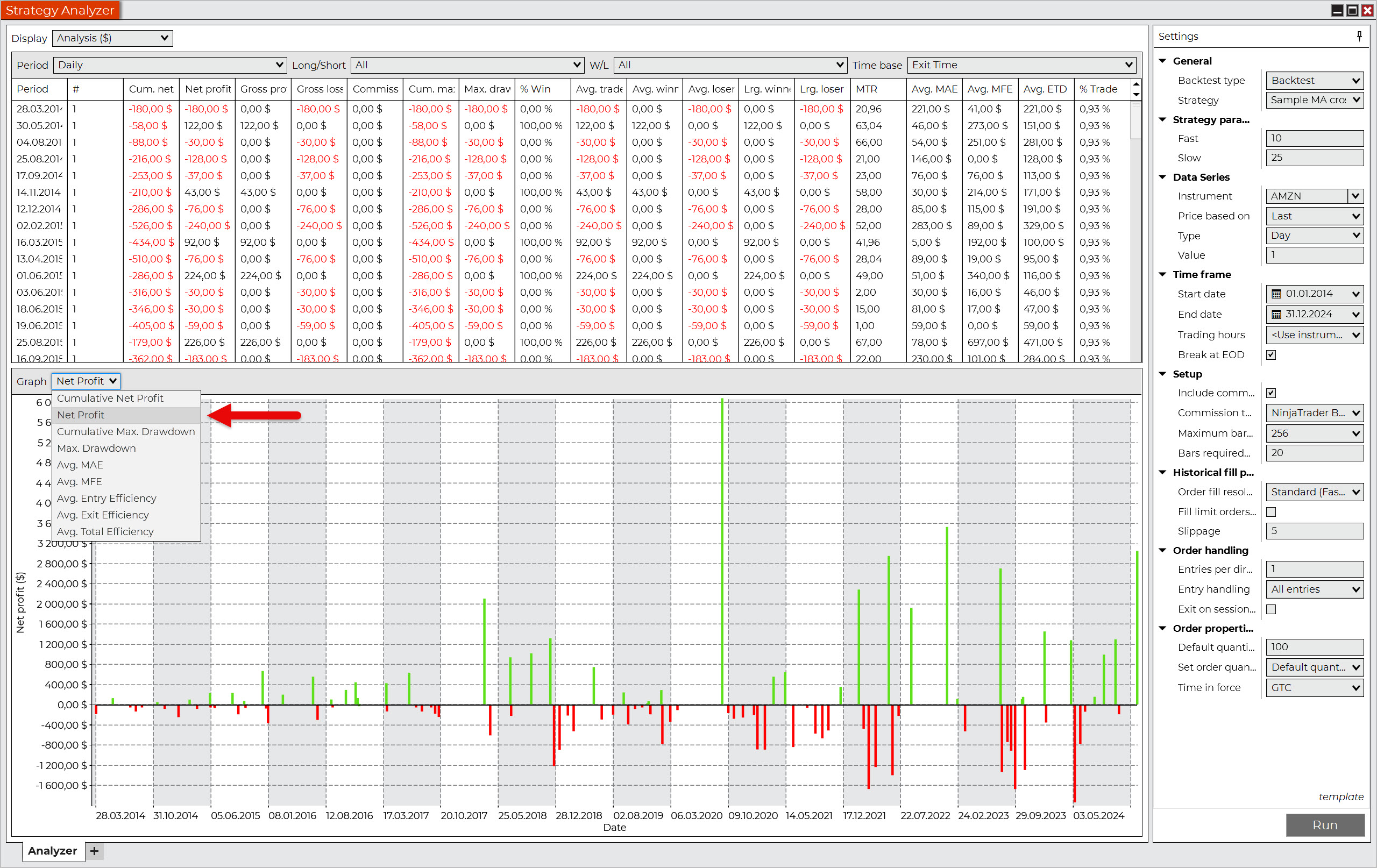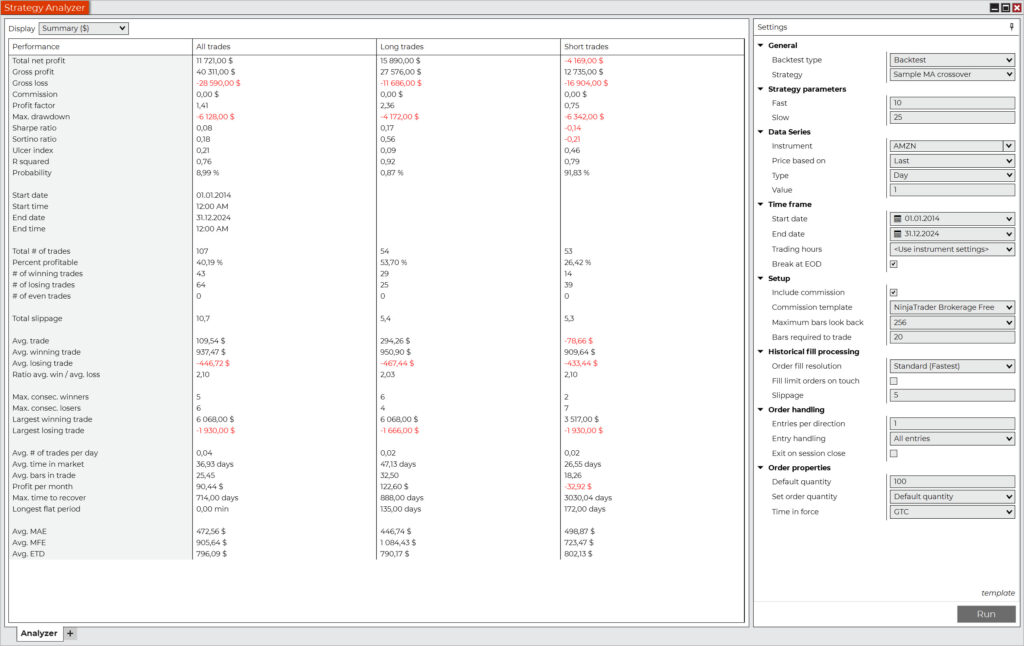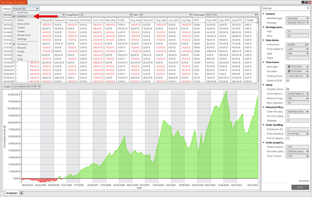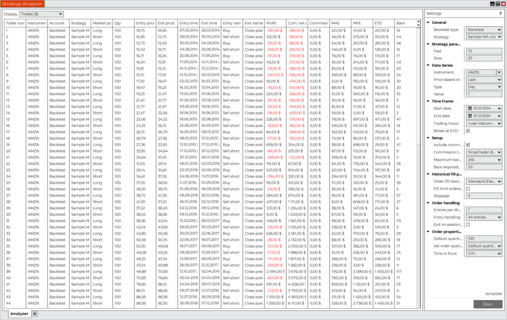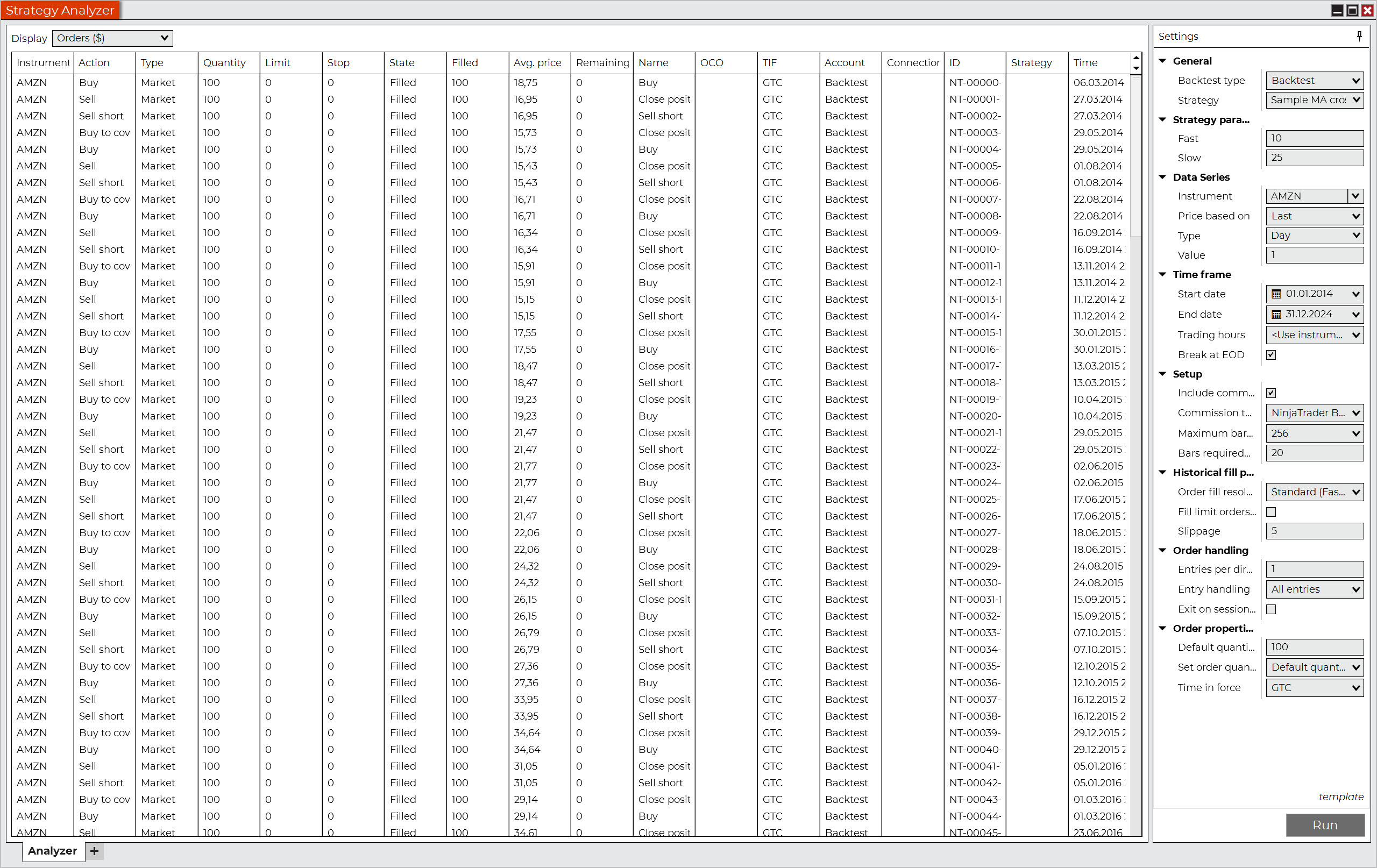 At your discretion, you can also select the execution slippage. NinjaTrader expects you to enter this value in ticks. Since we are backtesting the AMZN stock in our example, one tick corresponds to one cent.