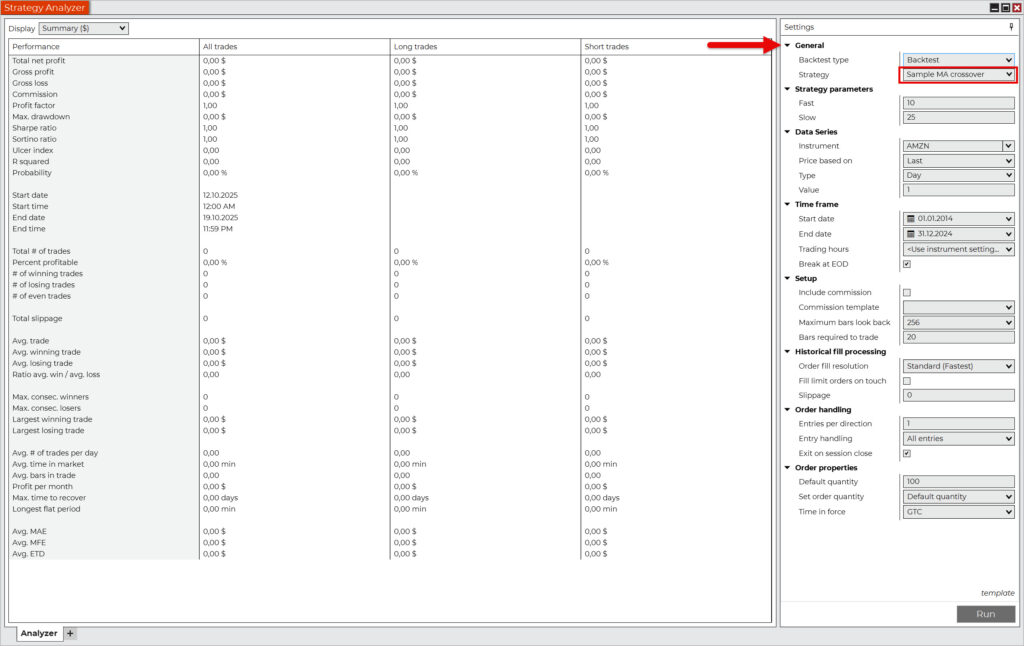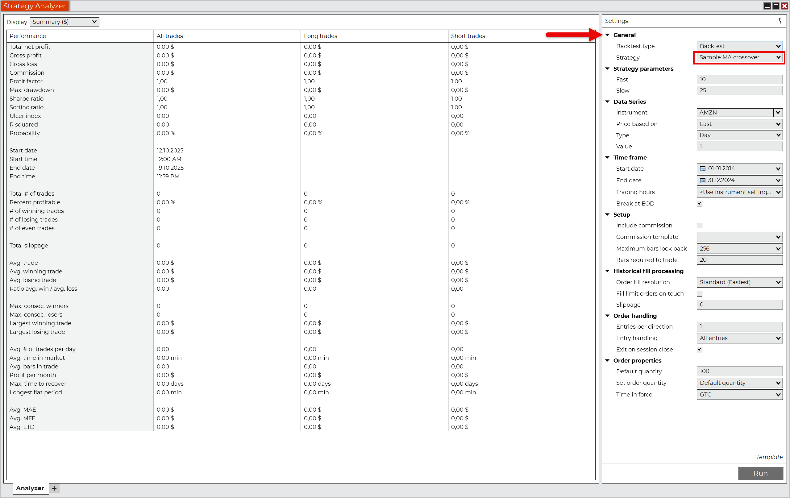 On the right side of the Strategy Analyzer window, you will find settings that determine how the automated backtest should be performed. In the General section, select the Sample MA crossover strategy.