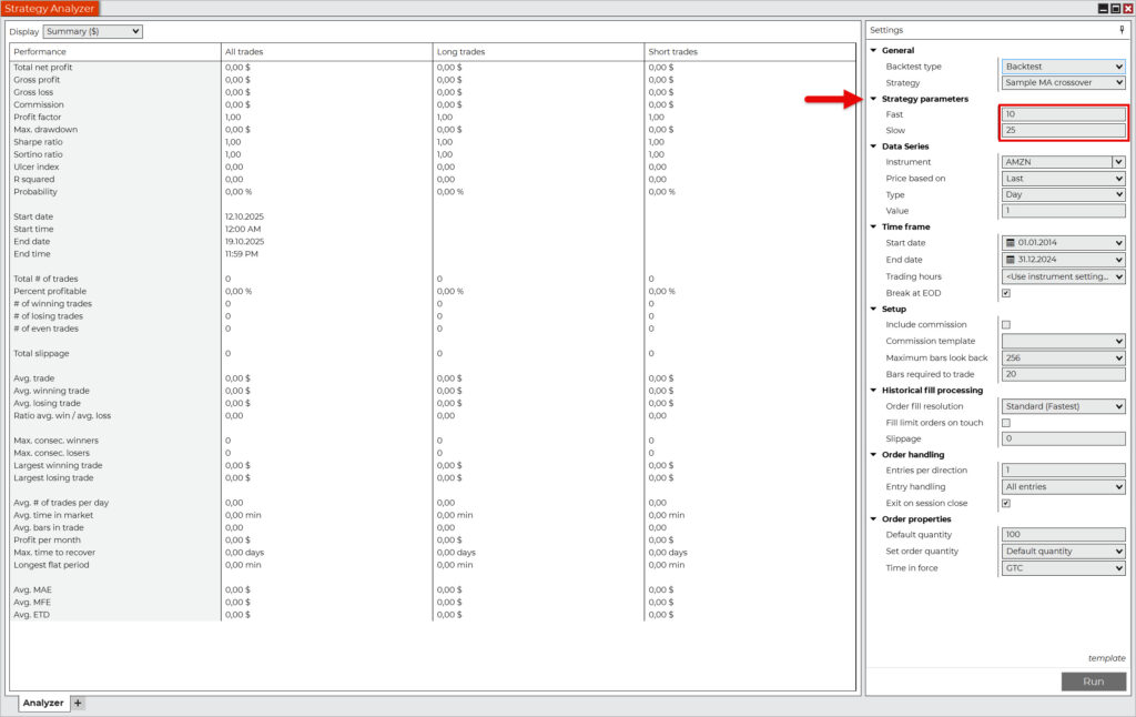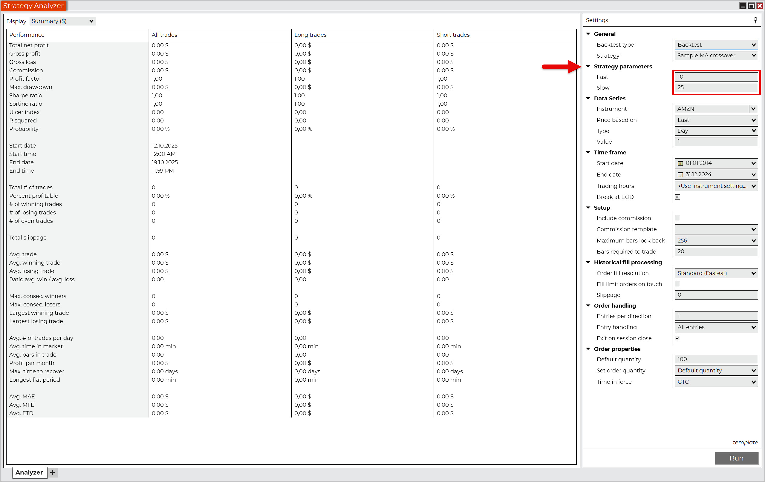 Next, you need to set the strategy parameters. This part is always different, as it is up to the developer to decide what can be set. In our example, we can set the period of the fast and slow simple moving averages.